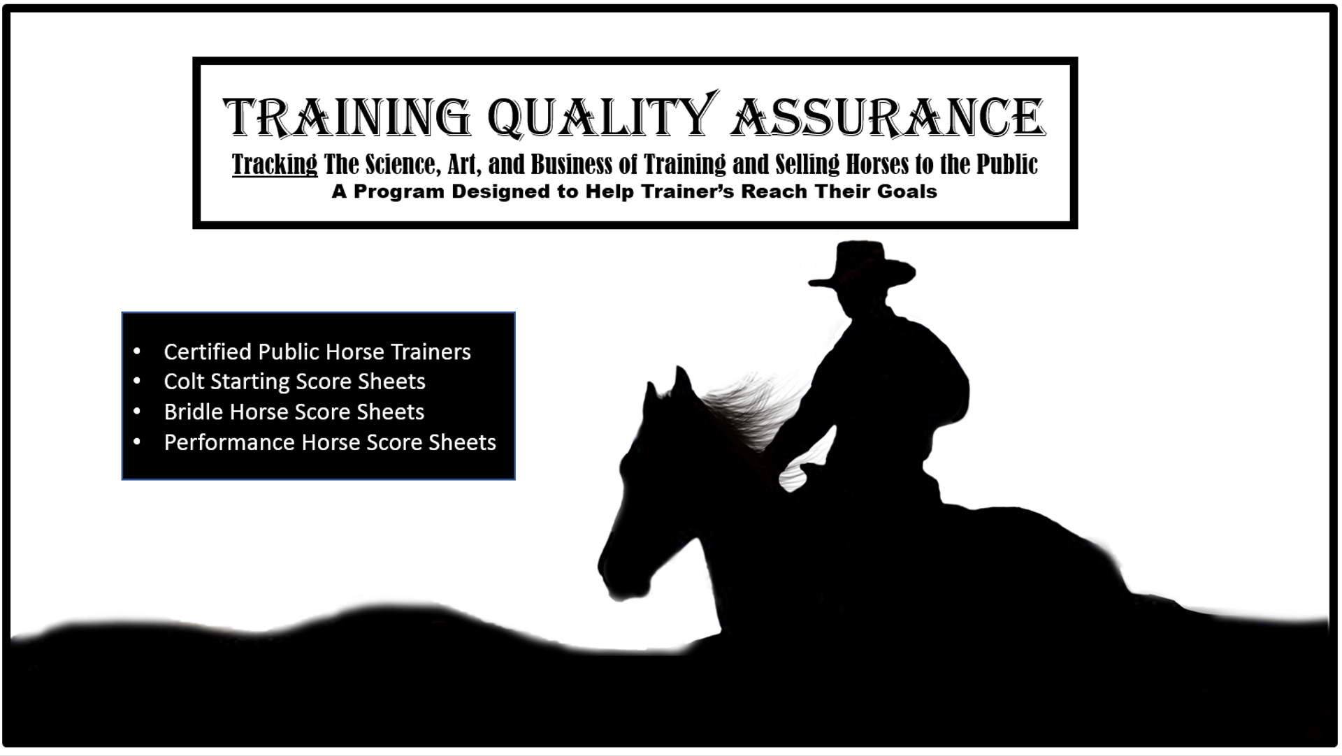 Training Quality Assurance (TQA) is a source of information to U.S. horse owners of how accepted scientific knowledge can be used to educate horse owners on the "starting process" and setting a solid foundation on a horse. TQA guidelines are designed to help both the producer (horse trainer) and the consumer (horse trainer's client). In the same way the foundation of a house determines the safety and security of the future building, the "starting process" (first 2 months) on a young horse should help to determine the safety and security of the future equine partner. TQA is working with experts in the industry to set quality standards to help the consumer determine who is truly qualified to "start" their horse. To help set industry standards and guidelines for qualification the welding industry has the American Welding Society, the automotive industry has the Automotive Service Excellence and Riding Instructors have the Certified Horsemanship Association. It is the goal and mission of Training Quality Assurance to help set standards and guidelines for training and selling horses to the public.