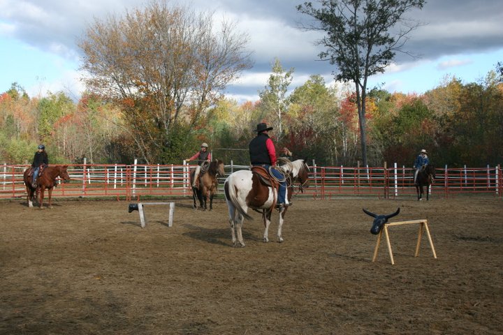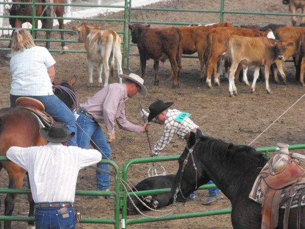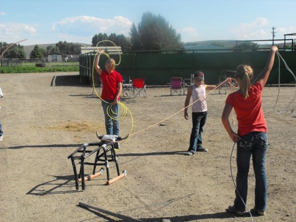 1. Ground Work - Rope dummy sitting on sawhorse, ride horse through obstacle course & rope, rope calves on foot.